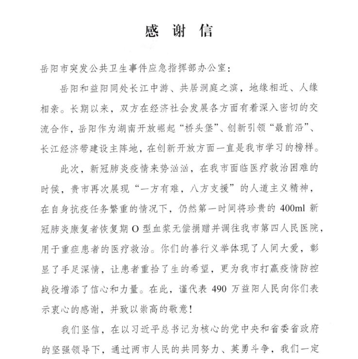 此次,新冠肺炎疫情来势汹汹,在我市面临医疗救治困难的时候,贵市再次展现“一方有难,八方支援”的人道主义精神,在自身抗疫任务繁重的情况下,仍然第一时间将珍贵的400ml新冠肺炎康复者恢复期O型血浆无偿捐赠并调往我市第四人民医院,用于重症患者的医疗救治。你们的善行义举体现了人间大爱,彰显了手足深情,让患者重拾了生的希望,更为我市打赢疫情防控战役增添了信心和力量。在此,谨代表490万益阳人民向你们表示衷心的感谢,并致以崇高的敬意!