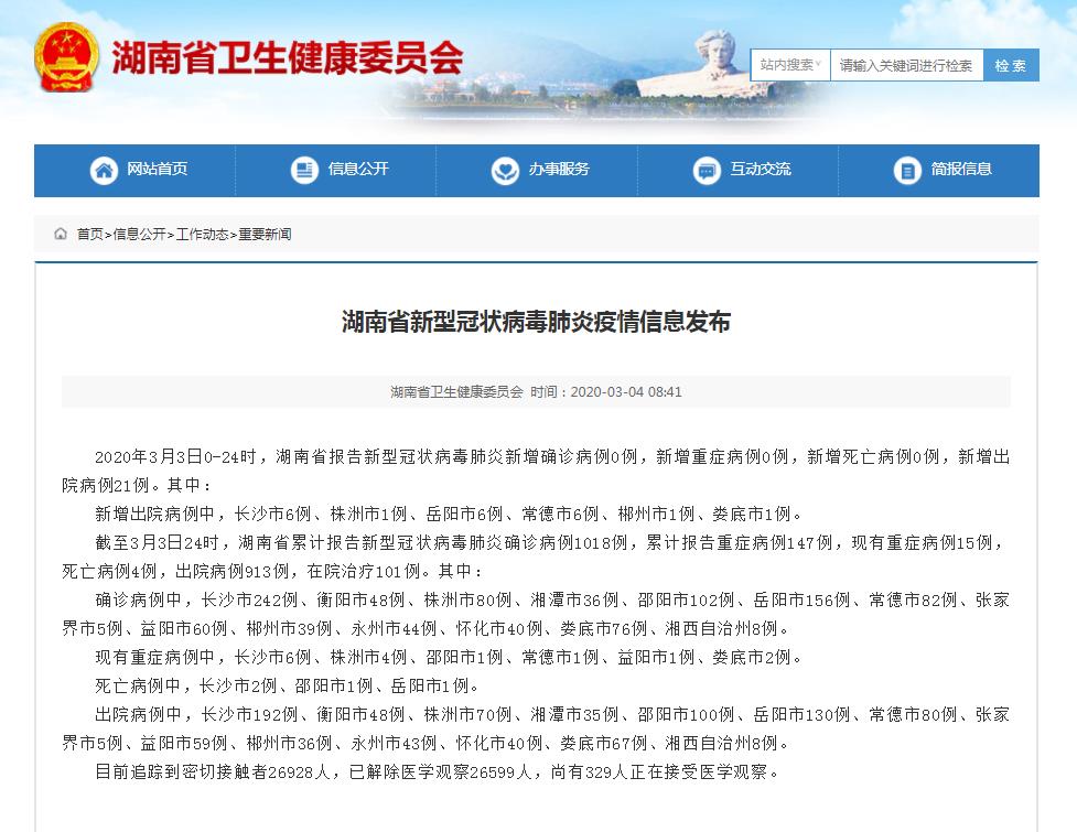 截至3月3日24时,湖南省累计报告新型冠状病毒肺炎确诊病例1018例,累计报告重症病例147例,现有重症病例15例,死亡病例4例,出院病例913例,在院治疗101例。其中: