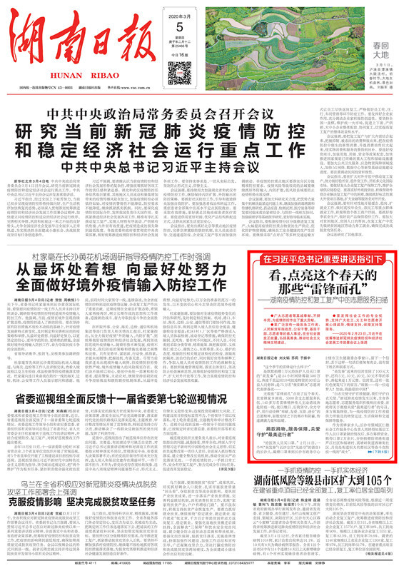 雷锋精神传三湘,关爱帮扶暖人心。广大志愿者积极投身疫情防控和企业复工复产、农村春耕备耕,为湖湘战“疫”增添了一抹暖心的“志愿红”。