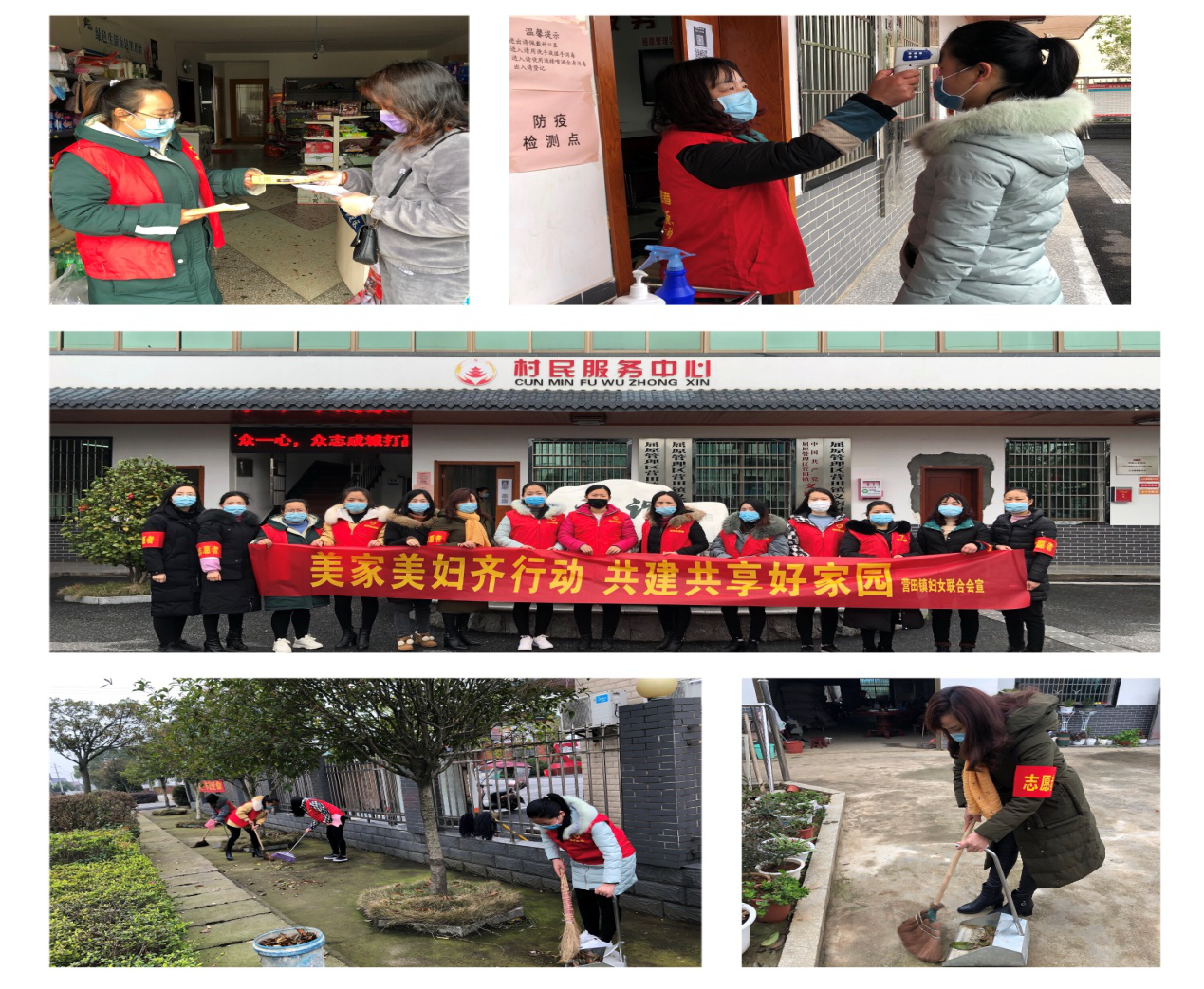 她们有的在清扫着公共区域的卫生,有的在清扫着自家的庭院,有的在上户进行疫情防控、美好家园建设和法制知识宣传,有的在村民服务中心给办事的村民测量着体温。