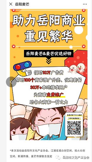 3月2日,协会联合会员单位岳阳麦芒、新潮传媒发起“助力岳阳商业重现繁华”活动。岳阳麦芒捐出10万广告费助力岳阳100个商家复工营业活动,发出去消息的第一天,就收到60多个商家报名,3月3日和5日岳阳麦芒连续在麦芒头条推出了多个商家活动,包括在疫情期间送货上门的餐饮商家、熟食、蛋糕、甜品、水果、生鲜、粮油、书店等等,得到广大商家的赞誉。新潮传媒岳阳公司响应总公司号召开展“百亿广告·春天行动”,新潮传媒提供总刊例价值100亿电梯广告资源,以支持疫情期间捐助抗疫的爱心企业,助力爱心企业品牌正能量传播,岳阳友阿集团、奥园、观澜紫台等企业上榜。