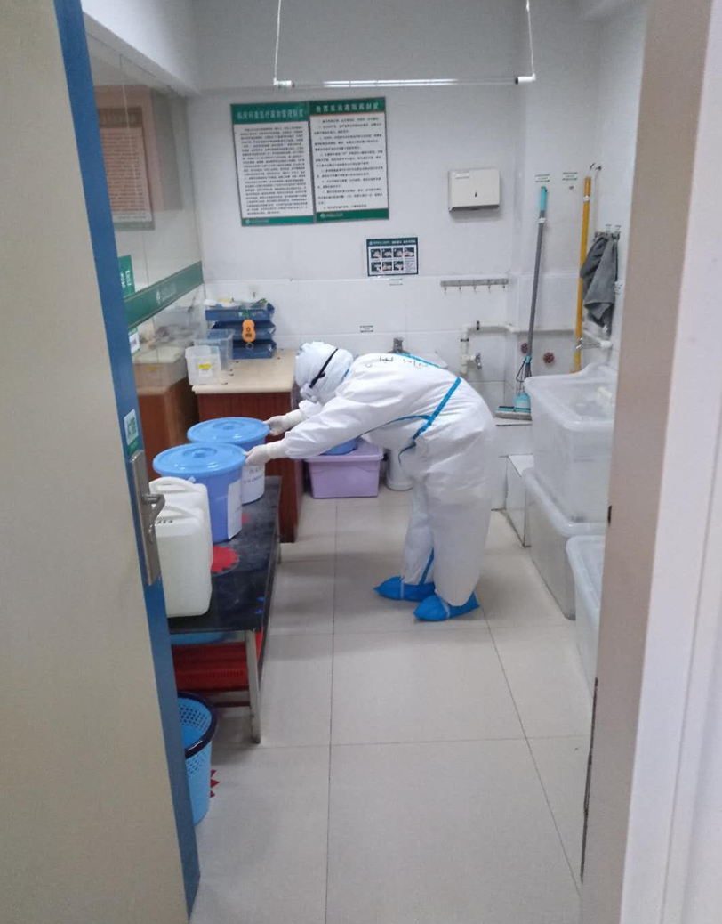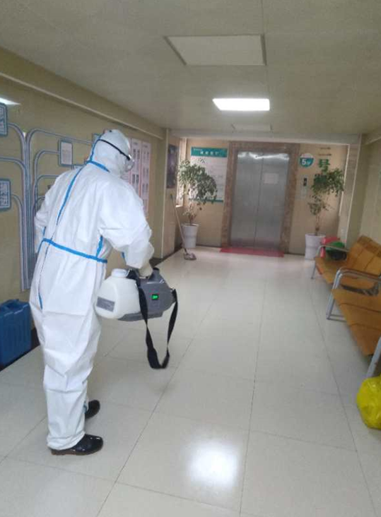 医务人员提着30多斤重的消毒器为隔离区消毒。