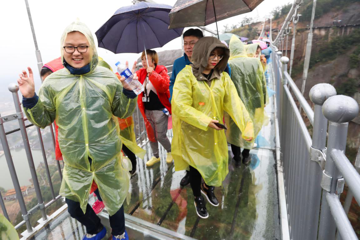 游客春雨中登石牛寨赏百里丹霞,别具风味