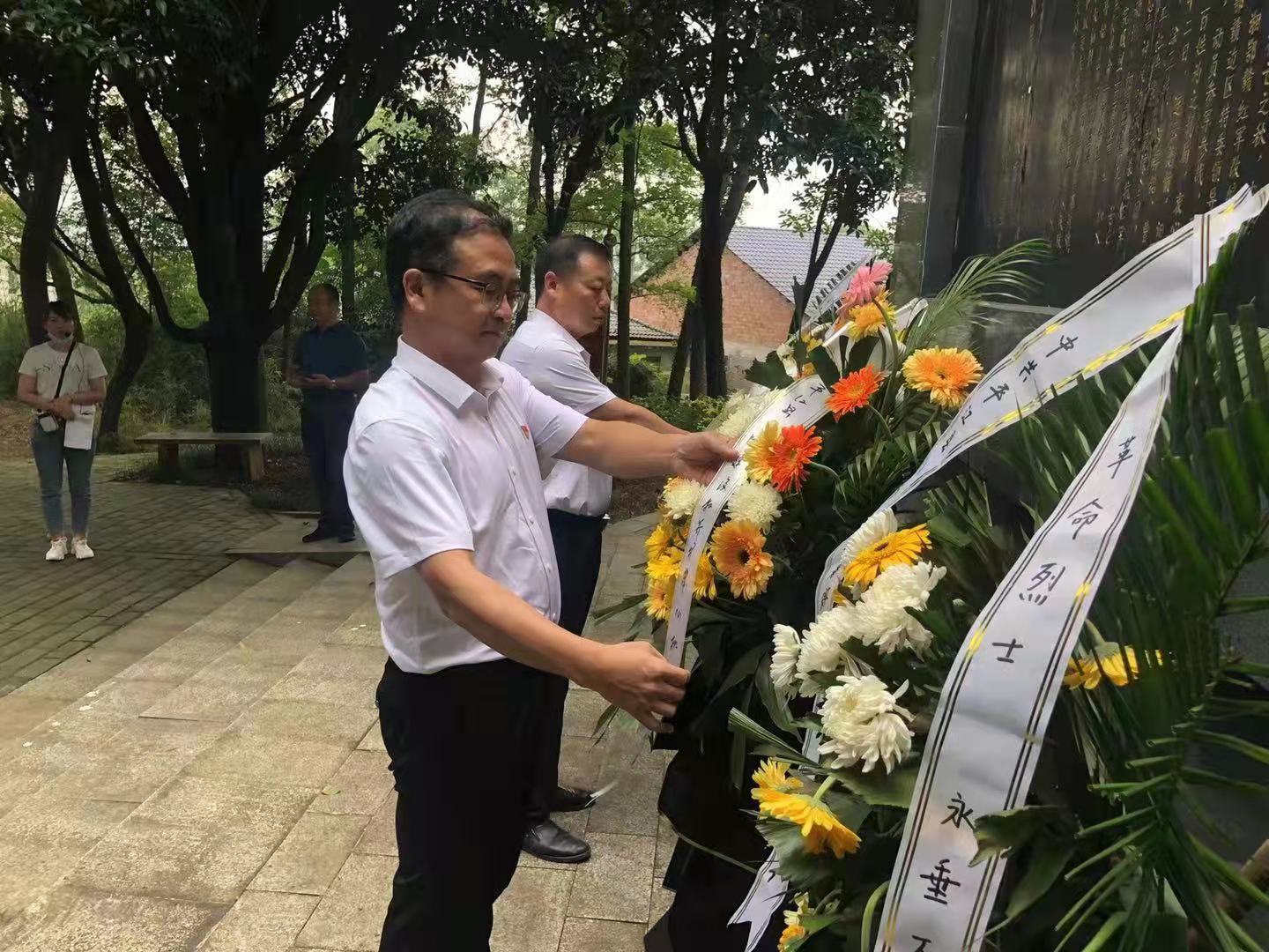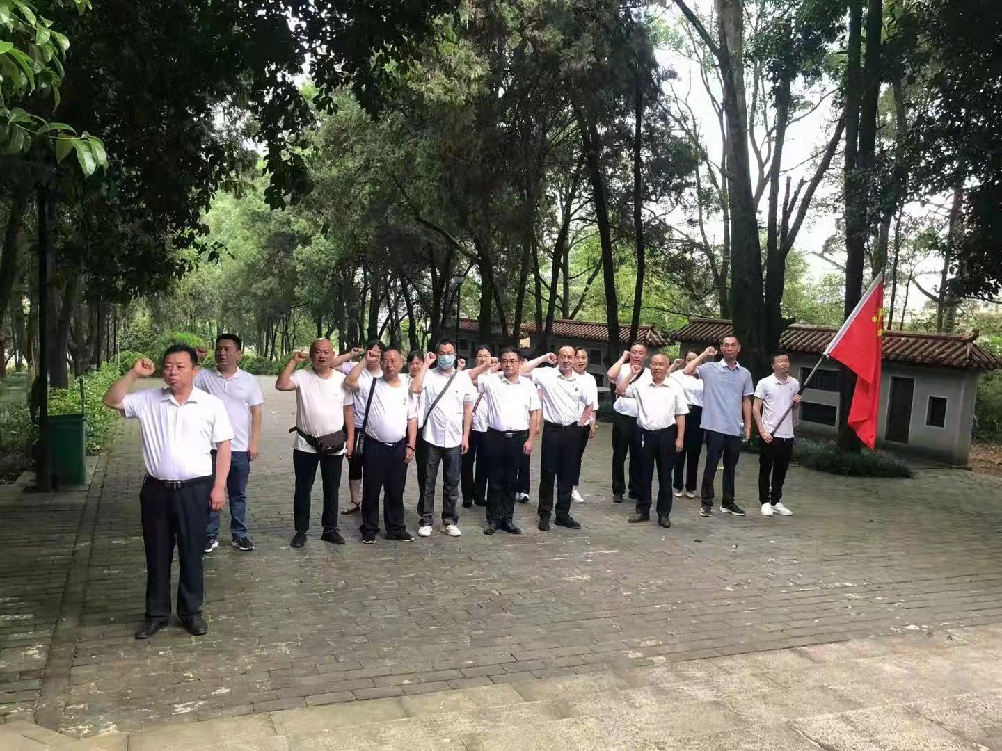 在庄严的革命烈士纪念碑前,全体党员神情肃穆、整齐列队,唱国歌,为革命先烈默哀一分钟,表达深切缅怀之意;面对着鲜红的党旗,大家高举右手,重温入党誓词;6位同志代表全体党员向革命先烈敬献花篮,鞠躬致敬,表达对革命先烈崇高的敬仰之情。