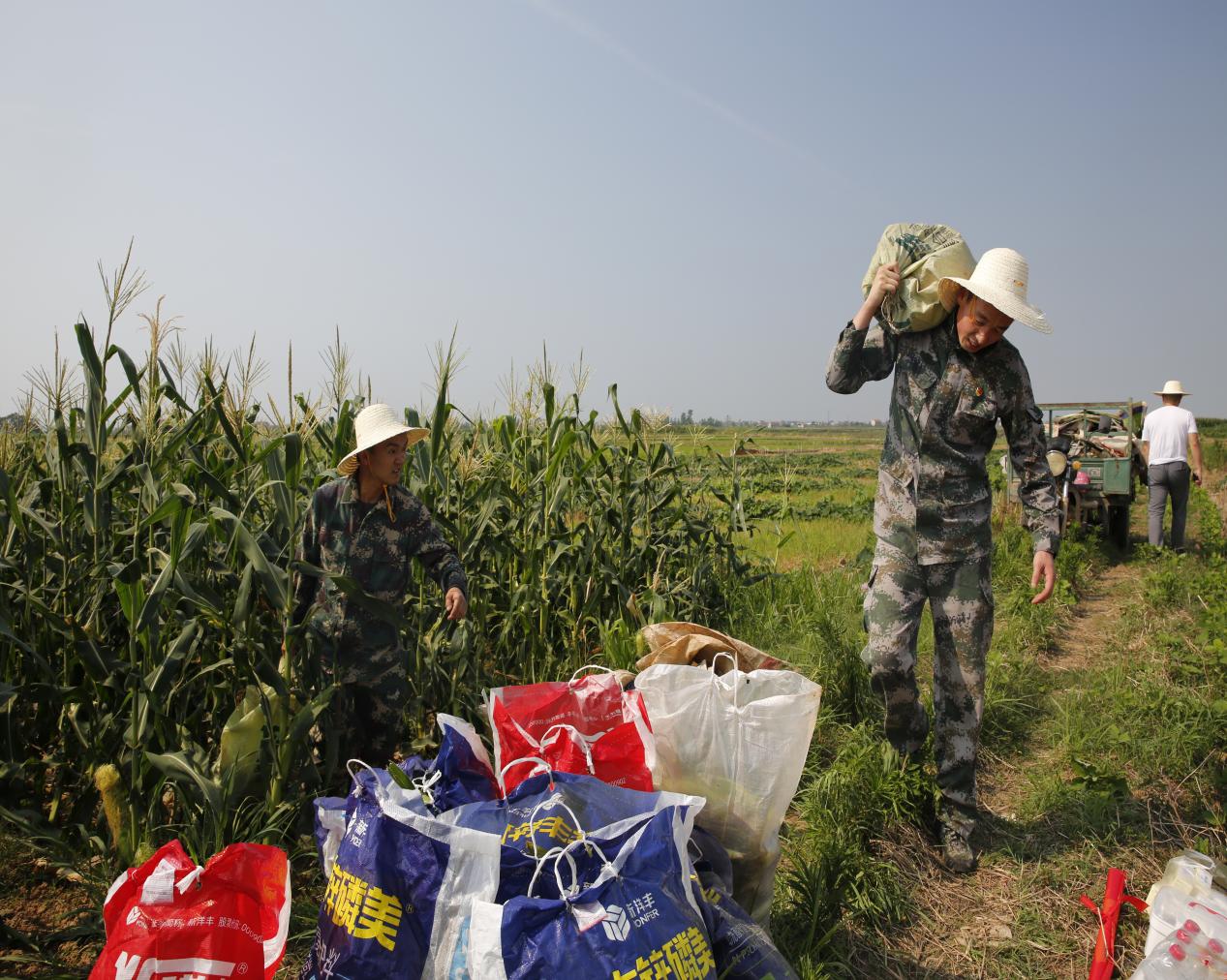 在热浪滚滚的田地里,志愿者们顶着太阳,大汗淋漓,大颗大颗的汗珠从头顶掉往脚下,许多志愿者头脸被蚊虫咬起了红疙瘩,手腕被玉米叶子划起了小口子,大家都不在乎,只顾一个劲地掰玉米、扛玉米、挑玉米,经过一天的紧张奋战,终于把8亩多玉米,12吨玉米全部收回了家。