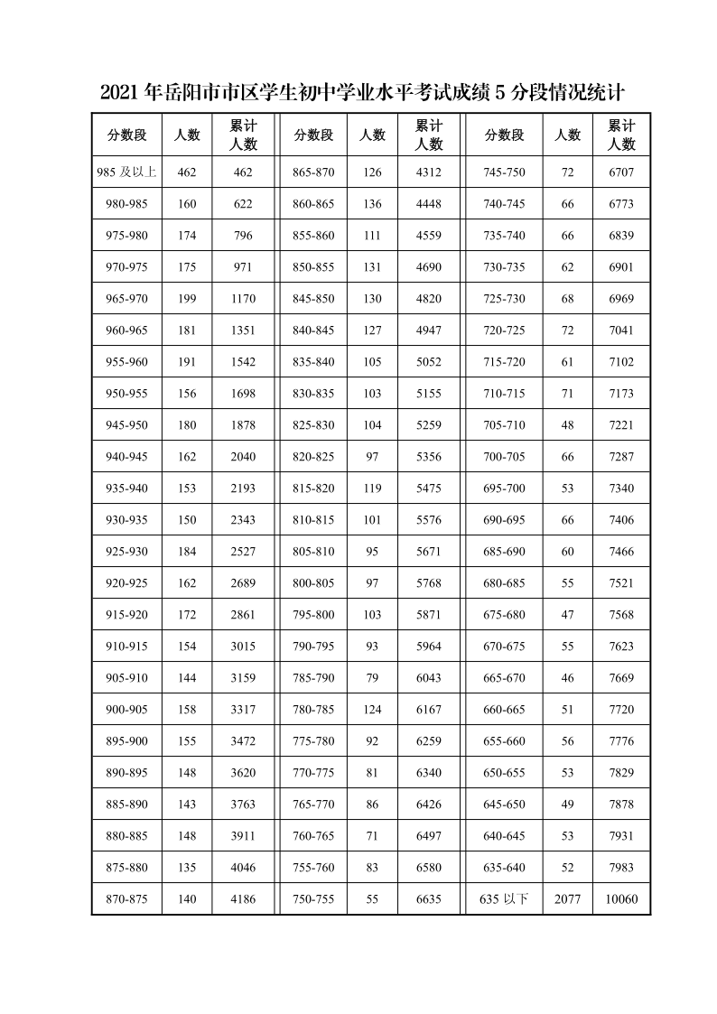 【热点】2021年岳阳市市区学生初中学业水平考试成绩5分段情况公布