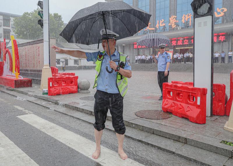 上午10点多,在屈原管理区营田镇屈原大道、兴盛大道、青年路多处积水路段。面对突然而来的暴雨,屈原交警甚至来不及穿上雨衣,就冒着倾盆大雨上路执勤,大队长、教导员、干警、辅警全部上阵,干警穿上的长筒套鞋已经全部灌满了雨水,多名干警干脆赤脚上阵,浑身湿透在膝盖深的积水中疏导交通。有的在积水浅处指挥绕道、有的在深水区帮助推车、有的在街边引导行人、还有交警守护在掀开的下水道盖板前。暴雨一直持续到下午2点才逐步减小,全体交警在暴雨中和灾害中,用自己的身躯为群众安全护航,也在暴雨和灾害面前向党的100周年生日献上一份厚礼。
