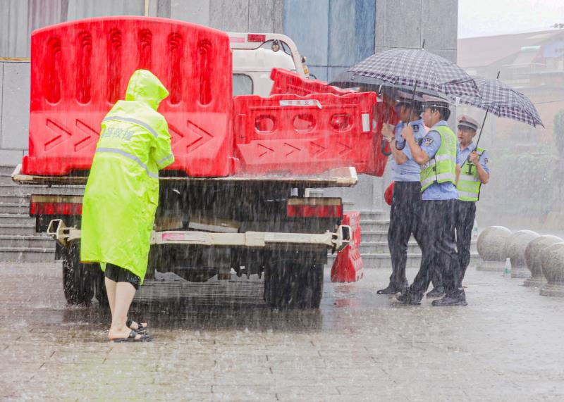 交警在暴雨中搬运水马设置安全路障