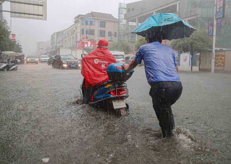 屈原交警在暴雨积水中为群众推车