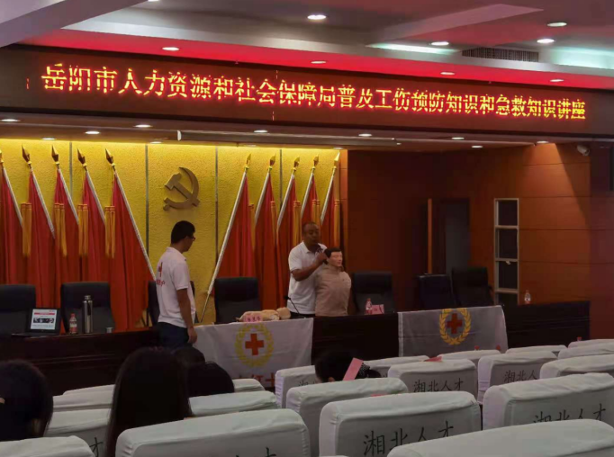为提高市人社局系统干部职工急救预防能力,降低工伤和其他意外事故发生率,切实保障干部职工安全和健康,7月21日,岳阳市工伤保险服务中心与红十字会,共同开展了工伤预防知识讲座培训与急救技能实操培训。