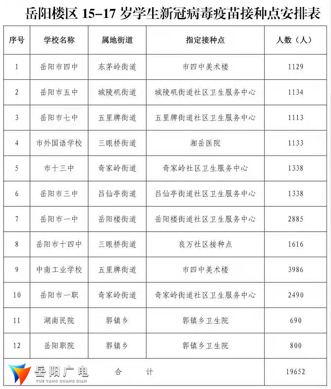 今天,岳阳市开始对15-17岁适龄无禁忌症的未成年人开展新冠病毒疫苗的接种工作。在岳阳楼区,为避开与18岁以上成年人群混合接种,卫健部门以学校为单位,按照地域范围划分,在中心城区共设置12个15-17岁人群的疫苗接种点,组建临时接种工作队,设置咨询引导展台,为学生提供绿色通道和便民服务,确保应接尽接。截至到7月底,岳阳市已累计接种疫苗达460万剂次。