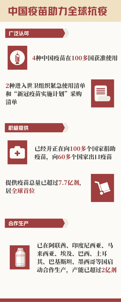 推动全球抗疫,特别是帮助广大发展中国家获取疫苗、应对疫情,中国的贡献有目共睹,国际机构和发展中国家代表予以高度评价——