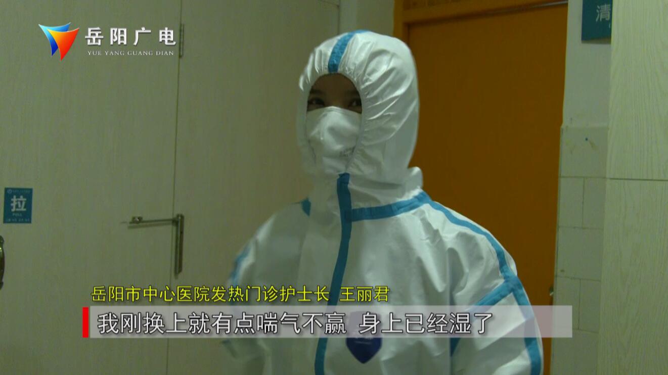 岳阳市中心医院发热门诊护士长 王丽君:我刚换上就有点出气不赢,身上已经湿了,(一个班下来要穿多长时间)四个小时。