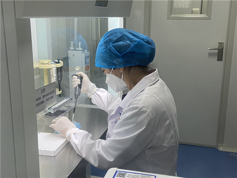 进入样本制备区后,汪丽要和另一名组员一起做好样本制备、灭活、加样和提取等工作。其中,在加样时,需要用加样枪将样本打入反应孔,每一份样本都要进行3次同样的动作,每天要重复3000多次。因反应孔口径小,加之护目镜和面罩上的水雾更让她们的工作增加了难度。