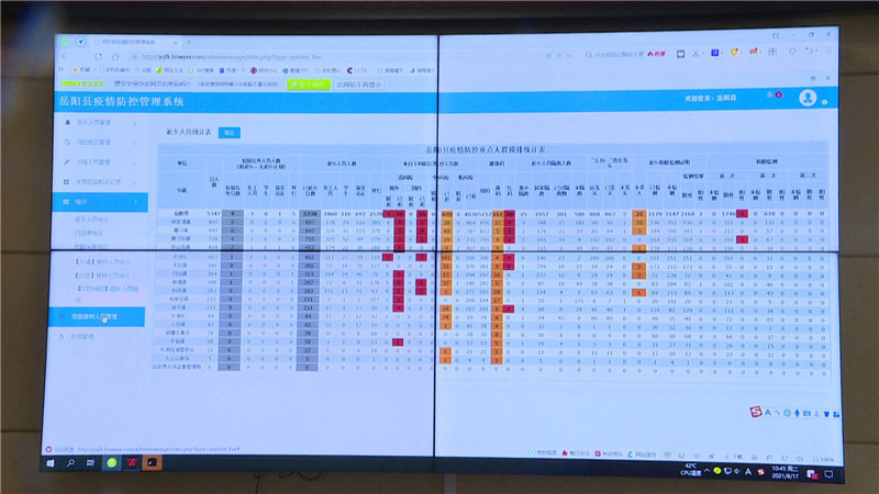 “喂,您好,请问是周先生吗?根据大数据的反馈,您是从中高风险地区回来的,是吧?需要了解一下您的基本信息,好吗?”在荣家湾镇巴陵社区居民服务中心,网格员通过电话了解核实返乡人员信息,并上传反馈至全县疫情防控管理系统,对其进行跟踪排查管控。县疫情防控指挥部数据分析组组长彭杰锋告诉记者:“是否有核酸检测、检测结果,指标都在系统上可以体现出来。”