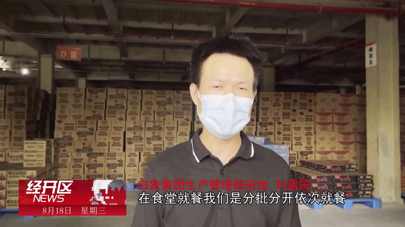 白象集团生产管理部班组 刘建国:除了正常的进出厂出示行程码健康码测体温之外,在食堂就餐我们是分批分开依次就餐,公司在准备了大量的防疫物资,还对员工的公共区域定时消杀。