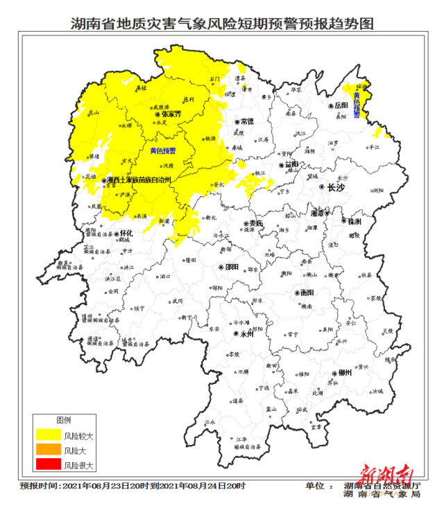 湖南日报·新湖南客户端8月23日讯(记者 彭可心 肖秀芬)受持续降雨影响,今天省自然资源厅与省气象局联合发布地质灾害气象风险预警:自8月23日20时至24日20时,湘中以北部分区域发生突发性地质灾害风险较大(黄色预警)。