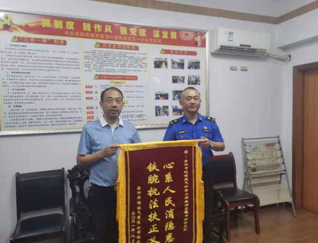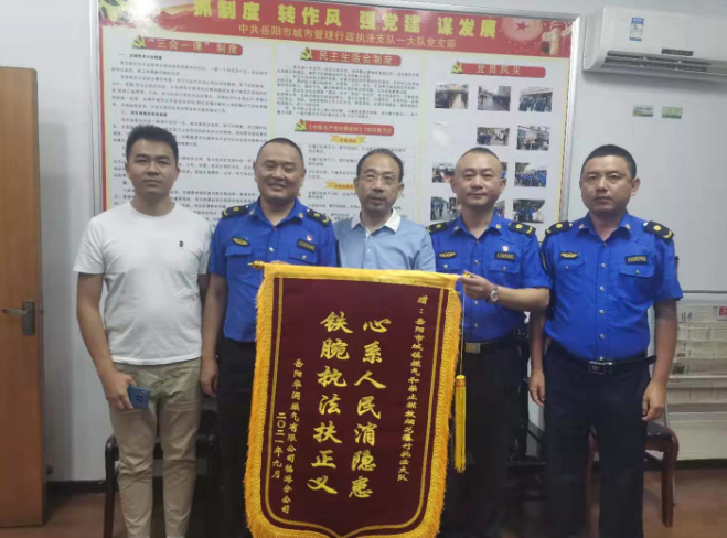9月17日华润燃气公司临港分公司副总经理叶玮、安全经理胡同飞特意来到燃禁大队送上锦旗,表达感谢。