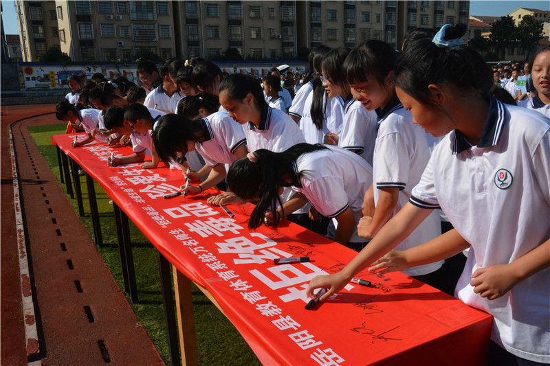 岳阳县融媒体中心9月24日讯(记者 周星亮 周雨萱 易漾娟)9月23日上午,县八中、县二中、荷花塘小学的学生在县八中联合开展“万名师生禁毒”宣传签名活动。