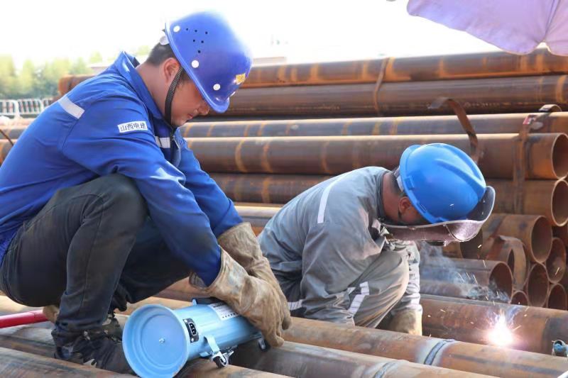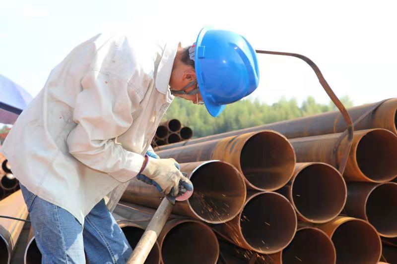 山西电建二工区的铁工在对地埋管道进行打坡口作业,以保证管道的焊接质量。