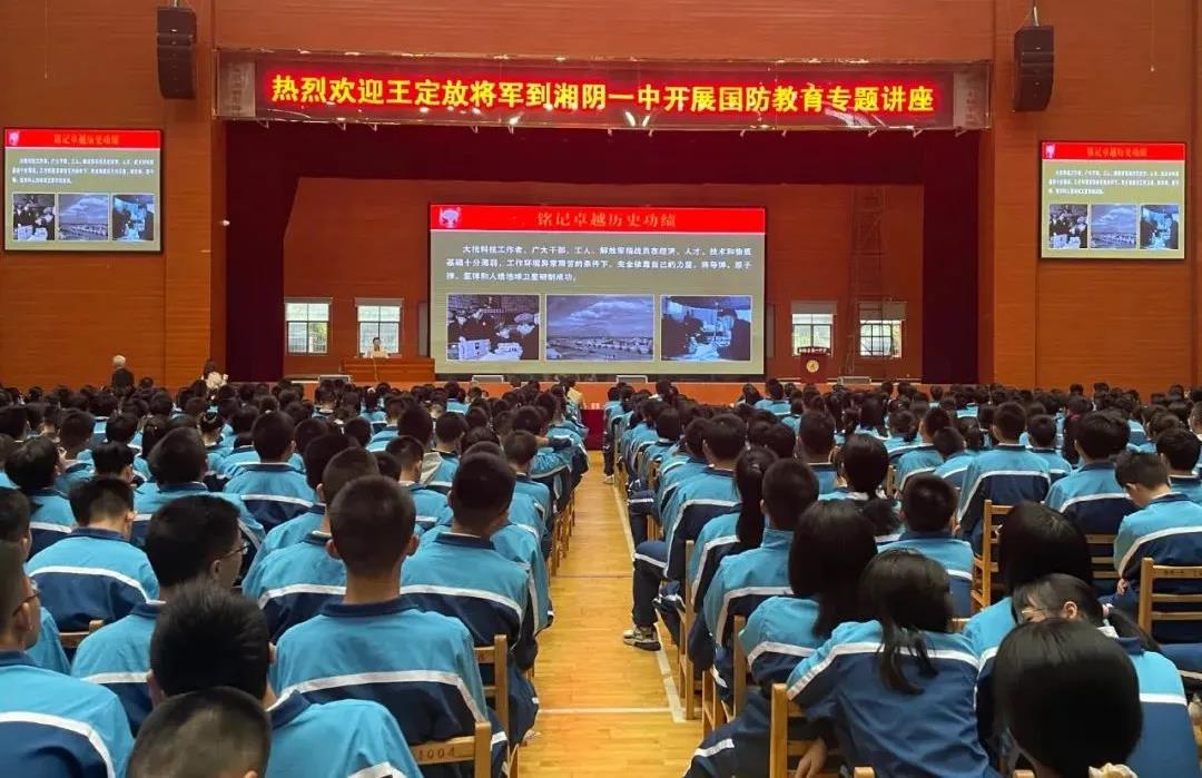 岳阳广电全媒体讯(湘阴县融媒体中心记者 项涛)10月9日,湘阴一中艺体馆内座无虚席、掌声雷动,王定放将军受邀回家乡开展主题为“大力传承弘扬‘两弹一星’精神,培养担当民族复兴大任的时代新人”的国防教育讲座,激励广大学子不断学知识、长本领,传承“两弹一星”精神,在追梦圆梦的实践中实现人生价值。该县县委常委、县人武部政委文渊参加。
